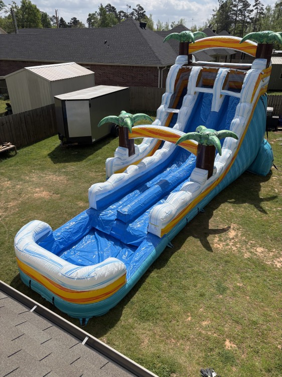 Bring the beach to your backyard with this 37x19x18-foot Surfs Up Dual Lane Hybrid Slide — a bright, tropical-themed inflatable that combines a roomy bounce-and-climb entrance with two side-by-side slides and a splash-ready landing. Designed for lively backyard parties and bigger events, the dual lanes let two riders race at once while the tall 18-foot slide face delivers a thrilling, fast ride. Palm-tree accents and ocean-blue colors give it a summery, island vibe that looks great in photos and draws kids in. Built as a hybrid unit, it pairs a safe climbing area and roomy platform with slide lanes that flow into a shallow splash pool, making it perfect for hot days or water play. Durable vinyl construction and high sidewalls help keep riders secure; the wide base adds stability during busy rentals. This inflatable is ideal for birthday parties, school events, church picnics, and company family days when you want an eye-catching centerpiece that offers exciting but manageable thrills for kids and teens.